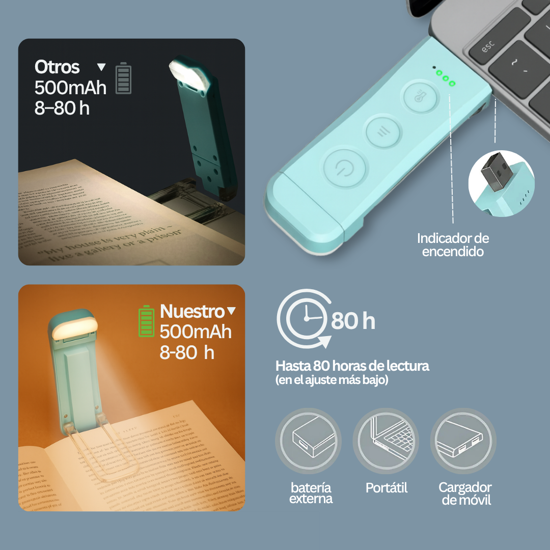Nuestra luz de lectura está diseñada para acompañarte sin interrupciones. Según el nivel de brillo y el tono de color que elijas, la batería puede durar desde 10 horas en el modo más brillante hasta 80 horas en el ajuste ámbar más bajo. Perfecta para terminar varios libros o llevarla de viaje sin preocuparte por recargarla constantemente.
